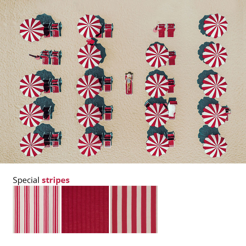 Le righe sempre presenti nella nostra collezione ricordano le tappezzerie delle spiagge della costa azzurra, che si fanno da complemento all’ azzurro del mare e ai rossi del corallo.