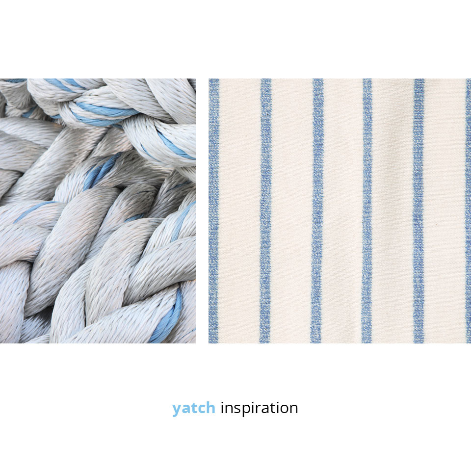 Le righe sempre presenti nella nostra collezione ricordano le tappezzerie delle spiagge della costa azzurra, che si fanno da complemento all’ azzurro del mare e ai rossi del corallo.